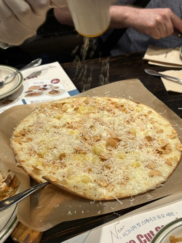 갈릭 스노윙피자에는 치즈 많이주세요라고 말씀드리니 직원분이 열심히 갈아주셨어요!