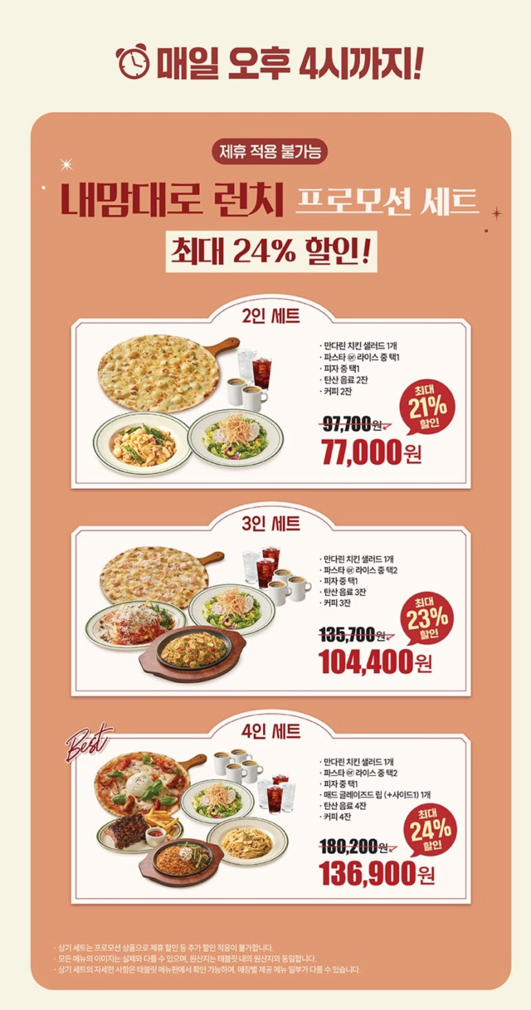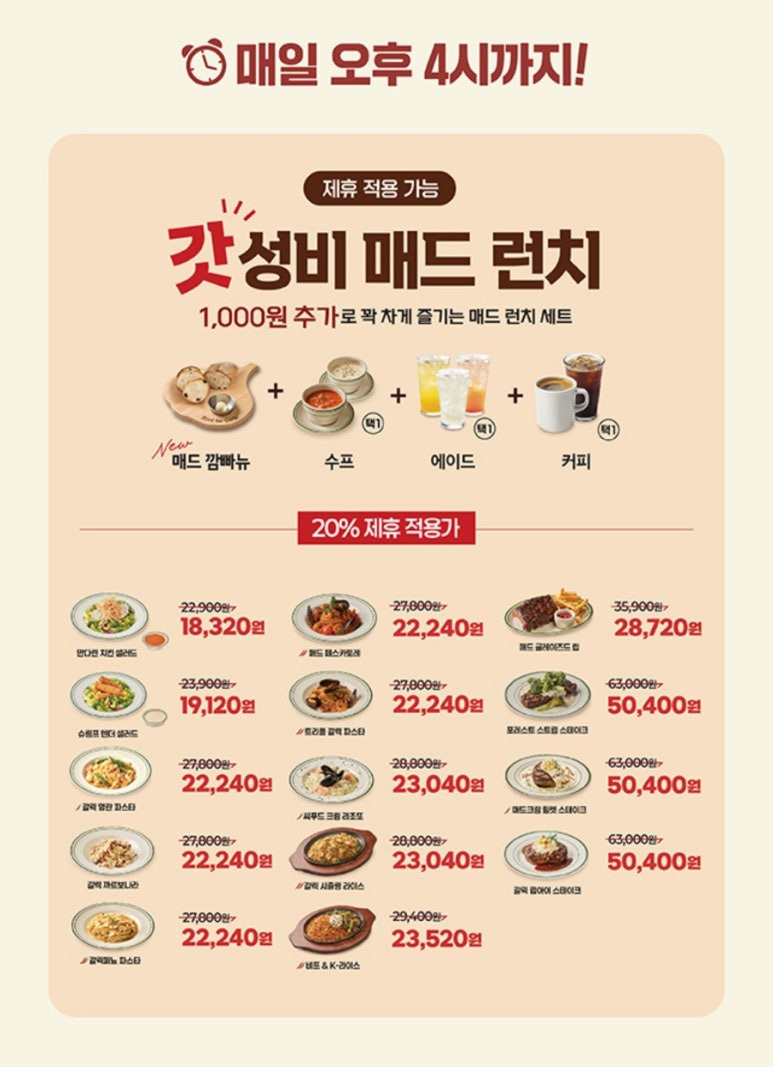 저희는 가족모임으로 간거라 7명이서 4인 내맘대로 런치 세트 (만다린 치킨 샐러드, 갈릭스노윙 피자, 매드 글래이즈드립, 갈릭 시즐링 라이스, 비브앤 케이라이스)그리고 갓성비 매드런치의 갈릭 립아이 스테이크, 갈릭 명란 파스타를 추가 주문 했어요!