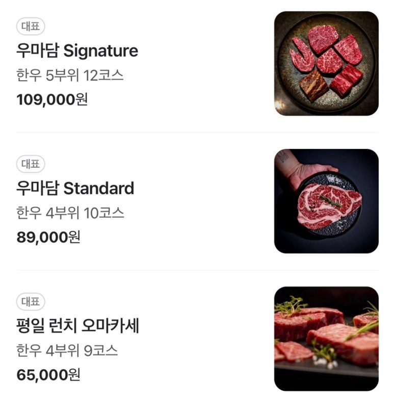 저녁 코스중에 저희는 5개 부위가 나오는 시그니처 코스로 예약했습니다