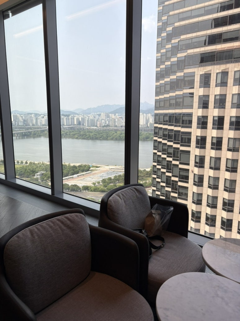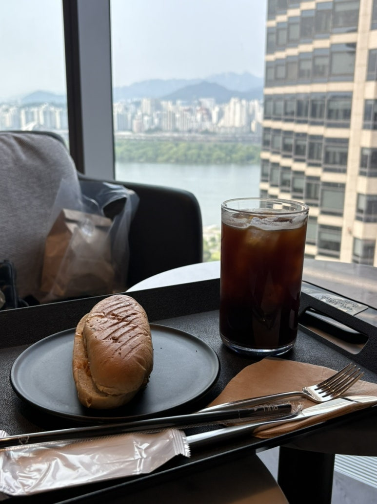 카페 들어서자마자 바로 옆에 엘지 트윈타워와 한강뷰가 보이는데요 통창으로 되어있어서 탁 틔인 느낌이 시원했어요